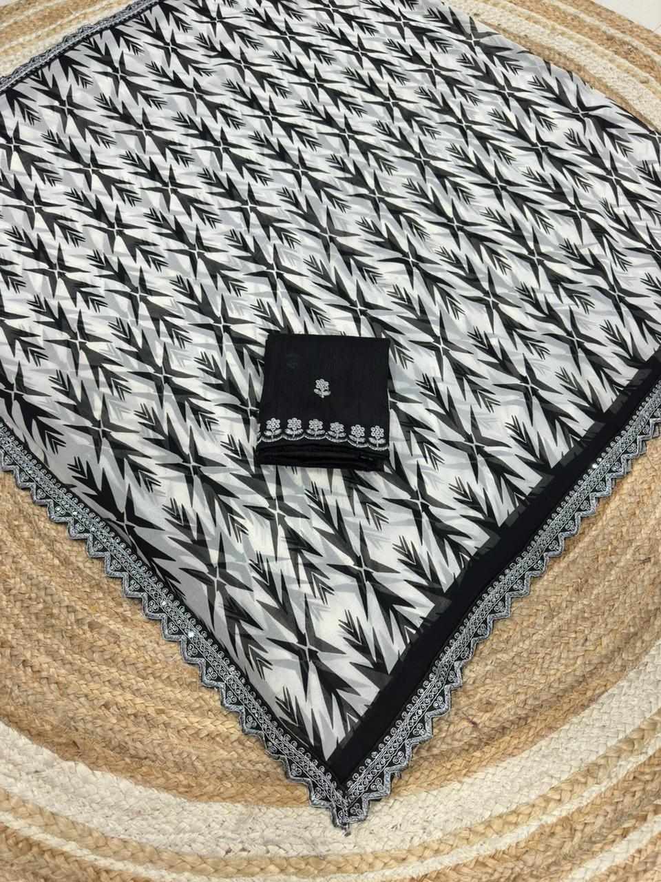 Crafted with graceful georgette and detailed coding embroidery lace work, this saree gives a rich and classy look. Perfect for festive occasions, parties, weddings, and special celebrations.