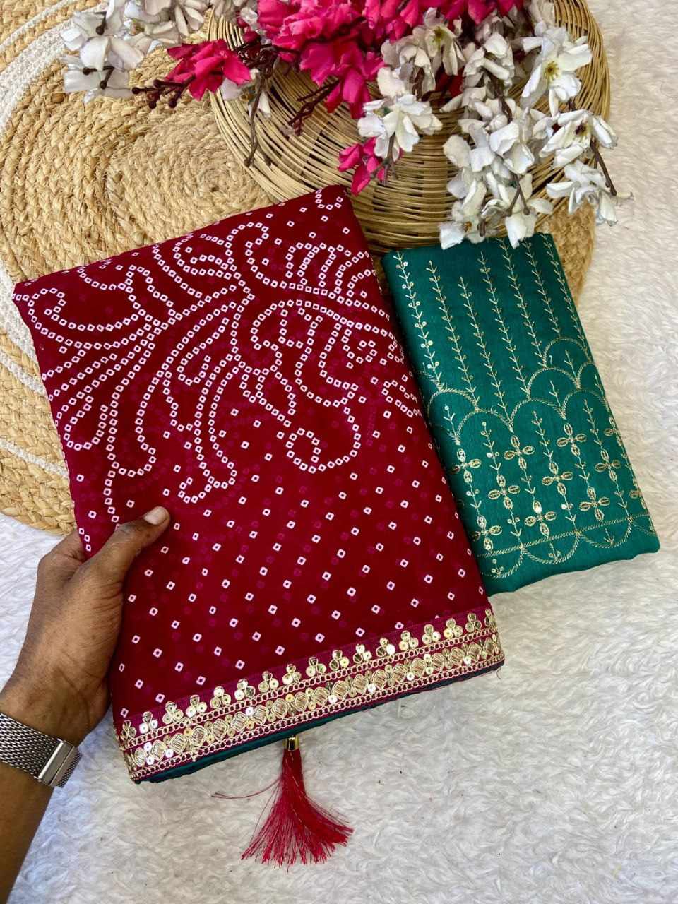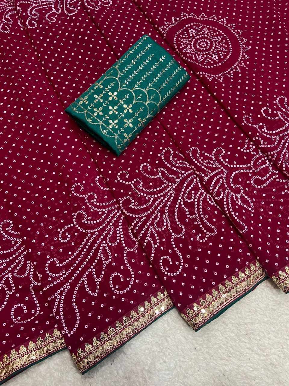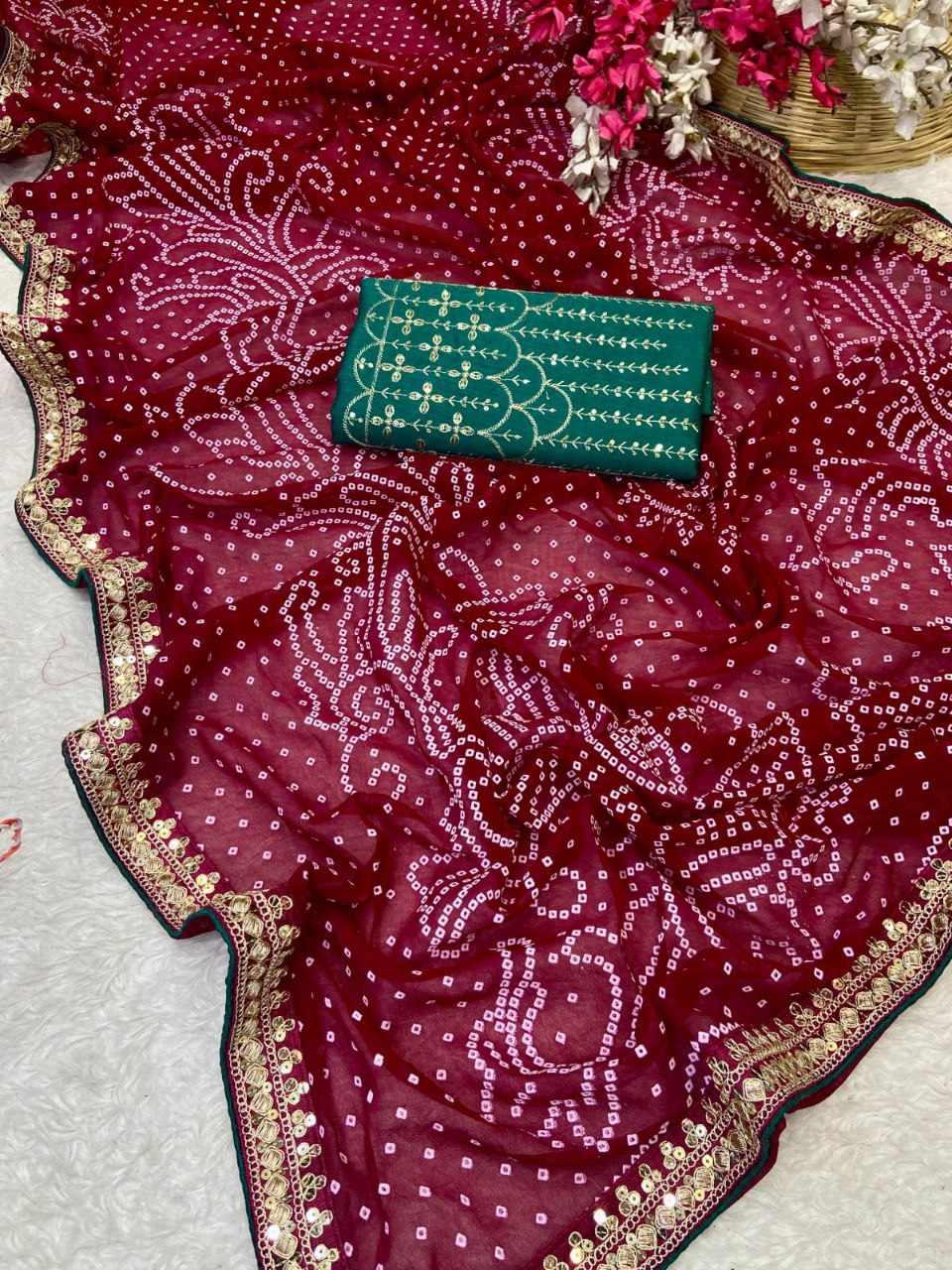 | Name : | RC Pink Bandhej Georgette heavy Coding Sequence border Saree |